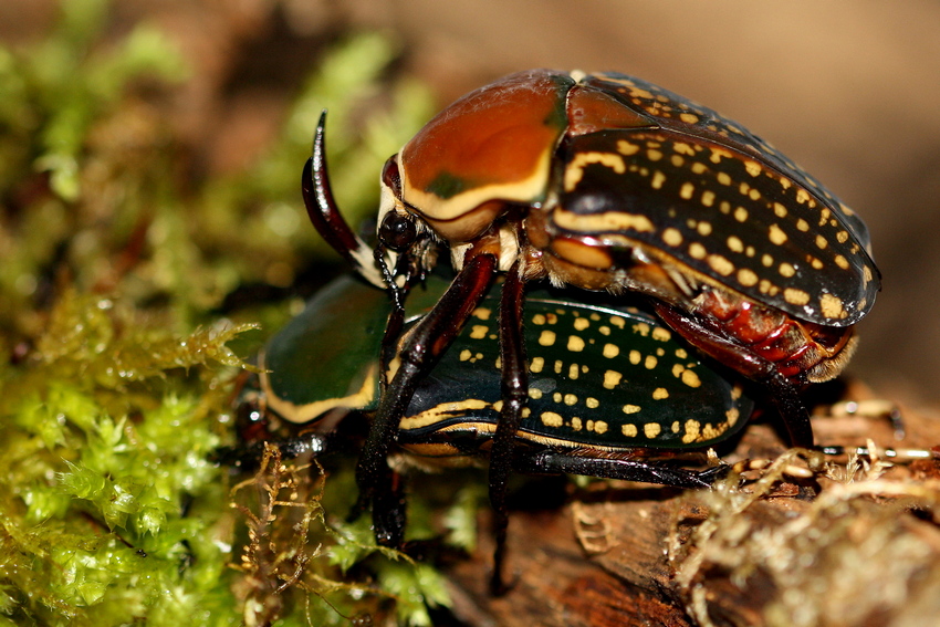 Im Winter 2024 erhielt ich 10 Larven dieser wunderschönen Rosenkäferart. Da die Larven vor allem in den jüngeren Larvenstadien (L1/L2) untereinander kannibalisch sind, zog ich sie einzeln in 5 l Boxen auf, was mehr als Platz genug für A. harrisi ist. Die Larven lassen sich gut in Laubwaldhumus großziehen, Additive in Form von getrockneten Shrimps wurden ebenfalls gerne angenommen. Die Temperaturen bewegten sich zwischen 18 und 22 °C. Im Frühjahr 2025 verpuppten sich die Larven, wobei sie die Kokons sowohl auf der Substratoberfläche als auch innerhalb des Substrats anlegten. Die Kokons ließ ich über die folgenden zwei Monate austrocknen, um sie dann wieder bis zum Schlupf der Käfer nach dreieinhalb Monaten wöchentlich durch oberflächliches Sprühen leicht zu befeuchten. Mit dieser Methode hatte ich keine Verluste während der ansonsten häufig heiklen Kokonphase.