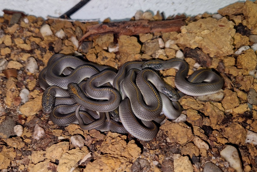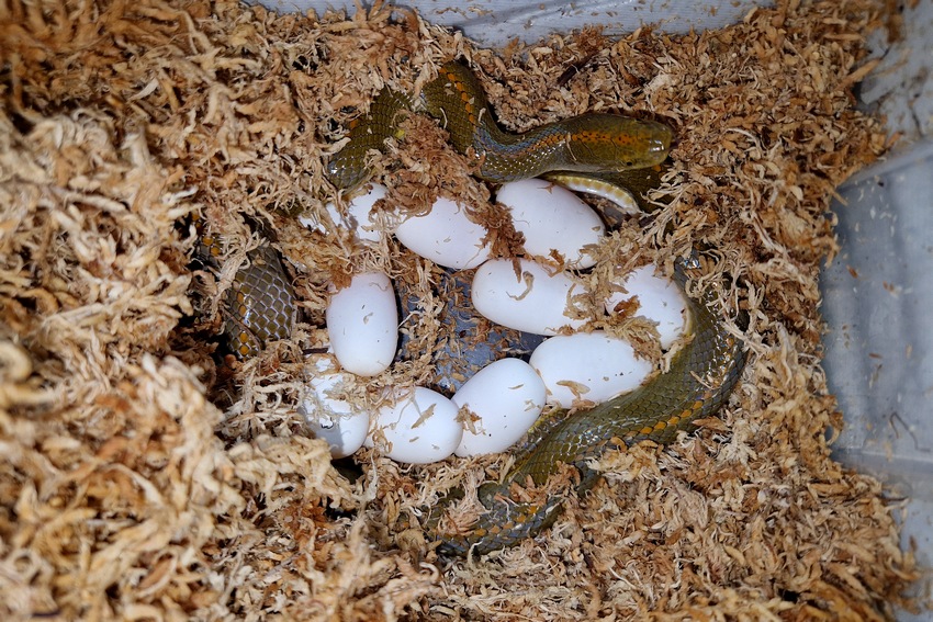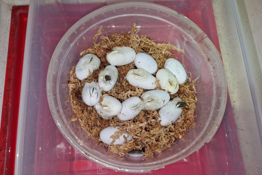 Im Frühjahr 2025 nahm das Weibchen beständig an Umfang zu und legte schließlich ein aus 13 Eiern bestehendes Gelege ab. Dieses inkubierte ich bei Temperaturen zwischen 25 und 27 °C mit Nachtabsenkung in Sphagnum. Nach etwa zwei Monaten schlüpften 13 gesunde Jungtiere aus den Eiern, die ich einzeln in kleinen Terrarien mit den Maßen 10x20x10 cm aufziehe. Die Jungtiere fressen nur sehr zögerlich Babymäuse, Echsen nehmen sie dagegen sofort.