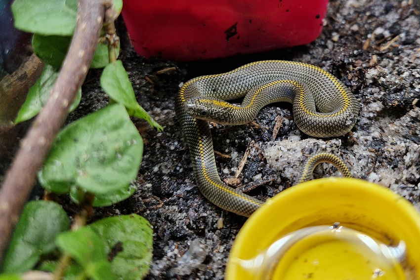 Ich erhielt ein Nachzuchtpärchen dieser traumhaft gefärbten Art im Frühjahr 2021. Die Jungtiere waren zu diesem Zeitpunkt etwa 20 cm lang unf fraßen bereits selbständig aufgetaute Babymäuse. Sie bezogen bei mir jeweils ein Terrarium der Maße 60x30x30 cm. Aufgrund der teilweise kannibalischen Neigungen der Art ist eine getrennte Aufzucht der Jungtiere zu empfehlen. Beide Terrarien stattete ich mit einem Sand-Erde-Gemisch aus, sie wurden reichlich mit Scindapsus-Arten bepflanzt. Im Bodengrund leben zahlreiche Weiße Asseln, die sich der Ausscheidungen der Schlangen annehmen. Zahlreiche Rindenstücke als Versteckmöglichkeiten, dünnere und dickere Kletteräste, ein Trinkgefäß und eine Wetbox komplettieren die Einrichtung. Beleuchtet wird mit einer LED-Leiste, die notwendige Wärme gewährleistet eine Heizmatte, die jeweils ca. ein Drittel des Terrariums erwärmt. Die Temperaturen liegen im Sommer bei 22 bis lokal 28 °C, im Winter kühlen sie auf 17-20 °C ab. Etwa einmal in der Woche wird gesprüht. Eine Überwinterung von ca. zwei Monaten bei Temperaturen 10-15 °C ist zu empfehlen, gerade wenn man die Art vermehren möchte.